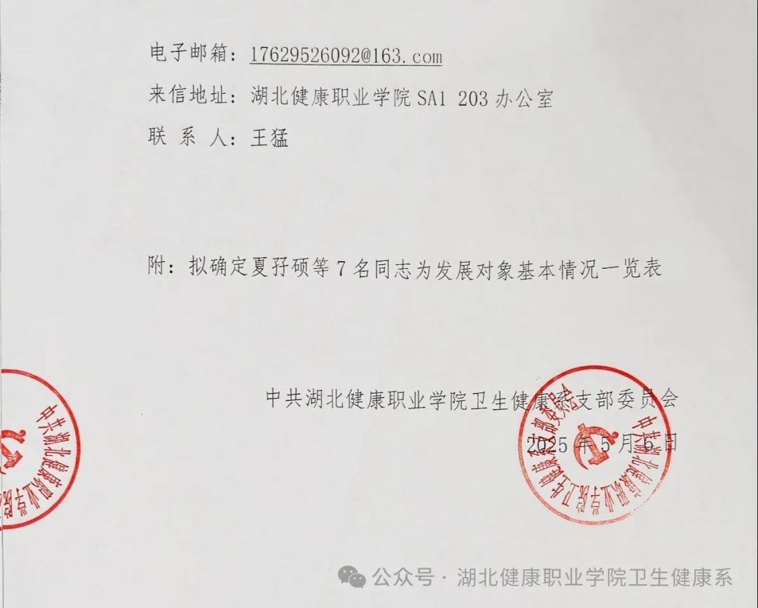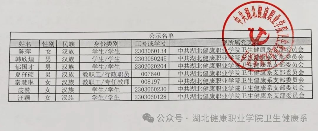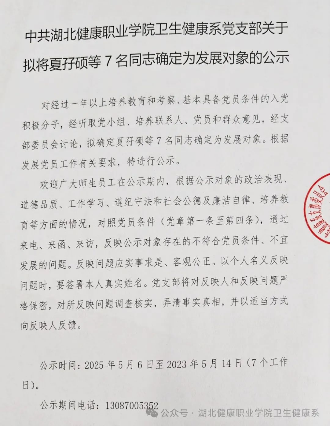 对经过一年以上培养教育和考察、基本具备党员条件的入党积极分子,经听取党小组、培养联系人、党员和群众意见,经支部委员会讨论,拟确定夏孖硕等7名同志确定为发展对象。根据发展党员工作有关要求,特进行公示。