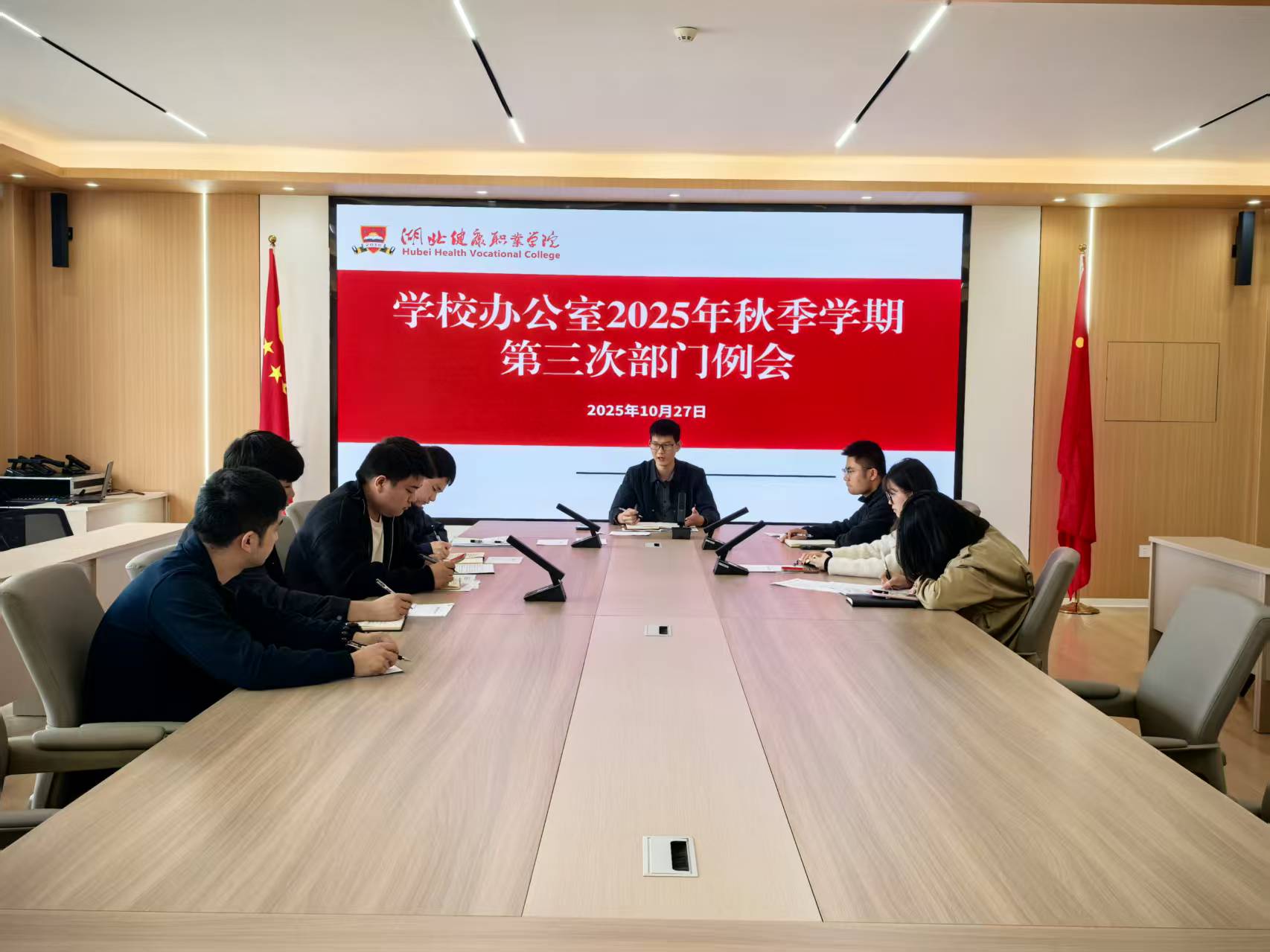 10月27日上午,学校办公室在学校会议室召开了2025年秋季学期第三次部门例会暨2025年春季学期绩效考核会议,学校办公室全体人员参加会议。会议由学校办公室主任李鹏主持。
