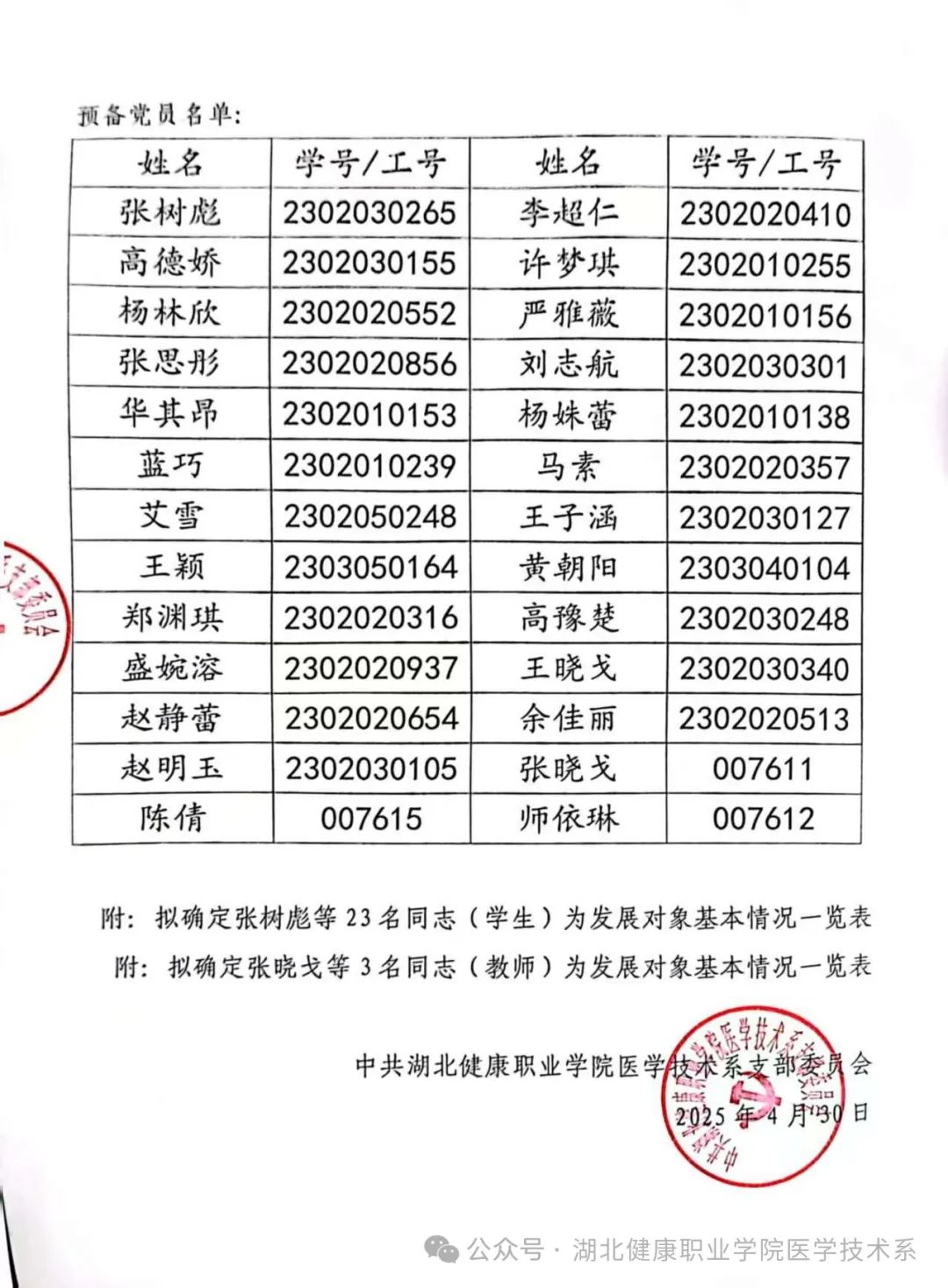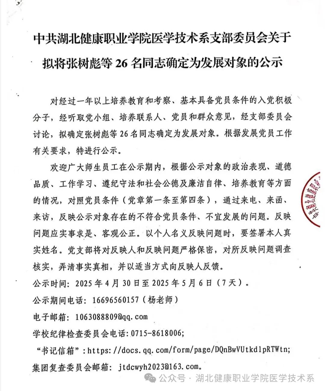 对经过一年以上培养教育和考察、基本具备党员条件的入党积极分子,经听取党小组、培养联系人、党员和群众意见,经支部委员会讨论,拟确定张树彪等26名同志确定为发展对象。根据发展党员工作有关要求,特进行公示。