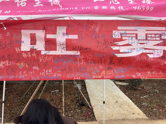为呼吁全体师生拒绝烟草,自觉抵御烟草的侵害,表明远离烟草的决心,特设置“禁止吸烟 允许发财”的横幅号召大家签名表示决心。