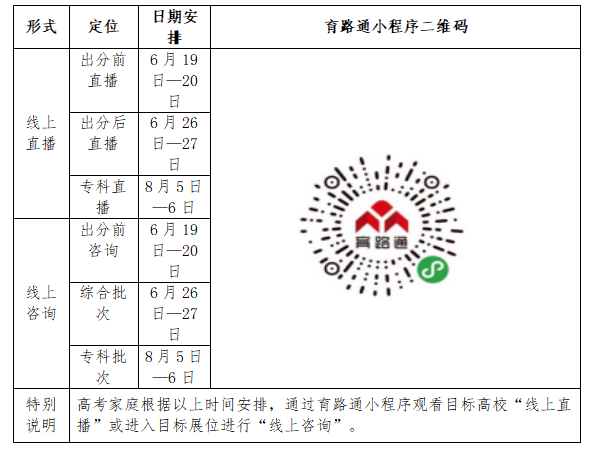 “线上咨询会”在“育路通小程序”呈现。通过线上高招会,高考家庭可以突破时空限制,通过视频、语音、文字、图片等方式,全面了解各高校的招生政策、优势专业、办学特色、人才培养等高招资讯,以云游校园的形式远程感受学校的学习环境和文化内涵。具体安排如下: