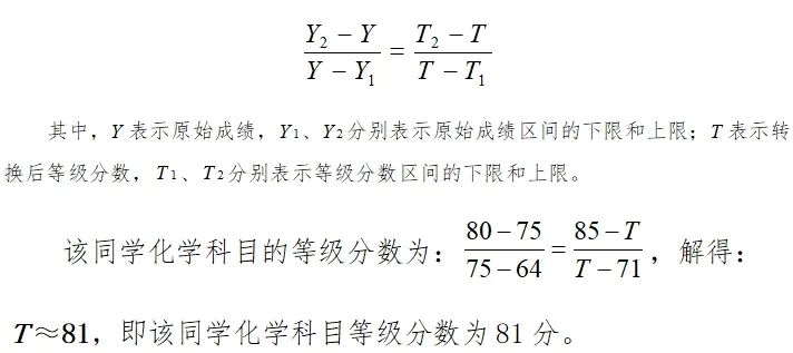 例如,某同学化学科目原始成绩为75分,按照原始成绩排序,等级比例应划分到B等级,而该科目B等级的原始成绩分布区间为80~64,等级分数区间为85~71,按照转换公式: