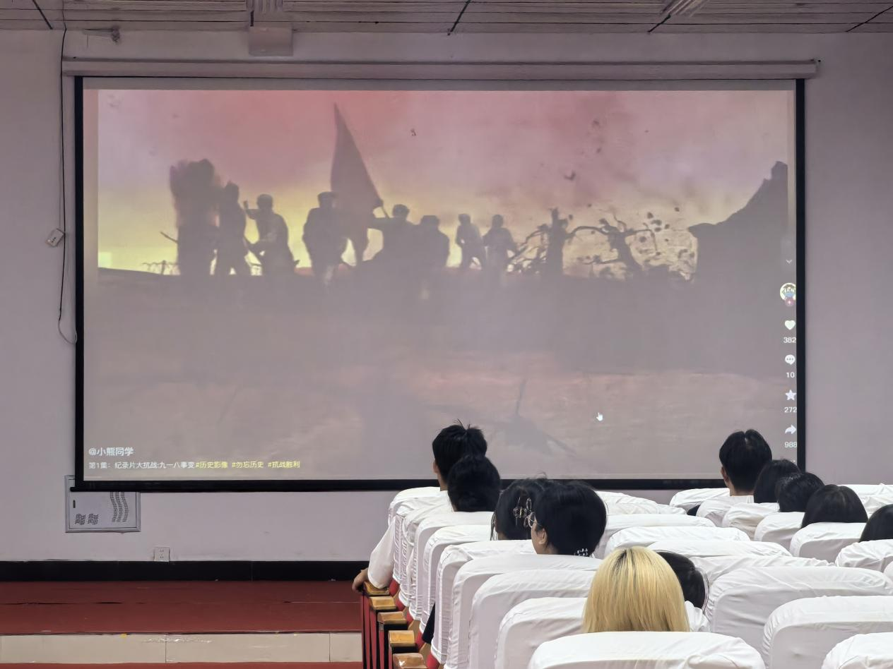 活动现场,师生共同观看纪录片《九一八事变真相》以及经典抗战电影片段《风云儿女》《狼牙山五壮士》等。影片引领大家深入了解九一八事变的历史背景与经过,深刻感悟先辈以生命和热血捍卫祖国尊严、民族荣誉的爱国精神。