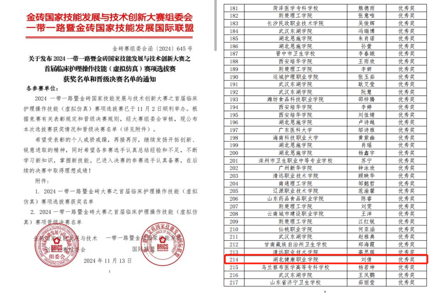 11月2日,2024一带一路暨金砖国家技能发展与技术创新大赛之首届临床护理操作技能(虚拟仿真)赛项选拔赛顺利举办。我系学子刘倩在比赛中表现突出,取得了优异的成绩。
