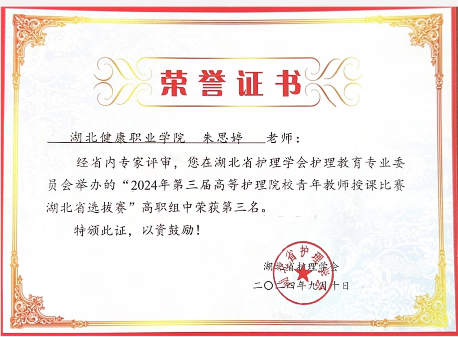 在湖北省护理学会护理教育专业委员会主办的“2024年第三届高等护理院校青年教师授课比赛湖北省选拔赛”高职组赛事中,我校护理系教师朱思婷表现卓越,经省内专家组严格评审后脱颖而出,荣获第三名佳绩。