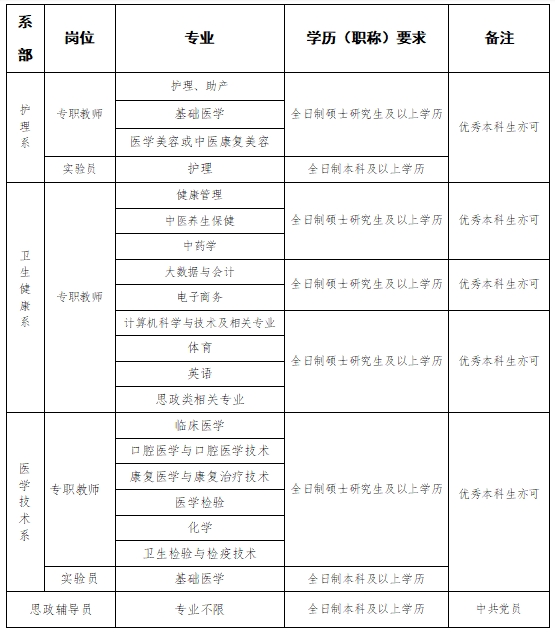 学校优化教师发展环境,大力实施人才强校战略,建立了一支专兼结合、结构合理的高水平教师队伍,实施“教师全员培训计划”,双师型教师校企协同培养,聘请国内外行业、企业、高校专家担任客座、兼职教授。 学校专业设置坚持就业为导向,服务市场需求,不断优化专业布局结构。设有“三系三部一中心”,即护理系、卫生健康系、医学技术系,基础医学部、公共教学部、培训部,实验实训中心。设有护理、护理(日语、英语、智慧医养)、老年保健与管理、健康管理、婴幼儿托育服务与管理、云计算技术应用(数字医疗技术)、康复工程技术、助产、康复治疗技术、医学检验技术、中医养生保健、医学营养、口腔医学技术、“计算机应用技术”“医学美容技术”“电子商务”“大数据与会计”等专业。