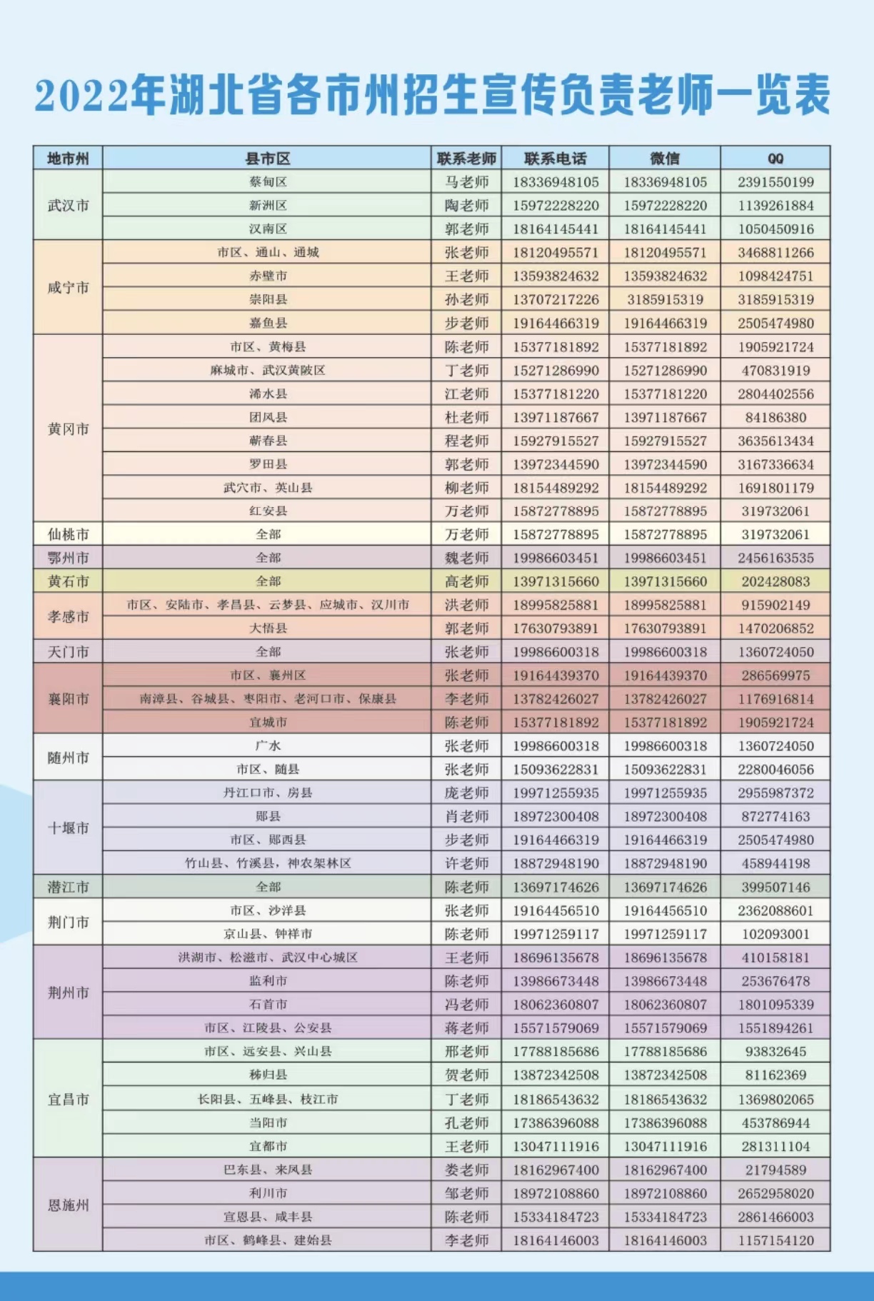 2022湖北省各市州招生老师一览表