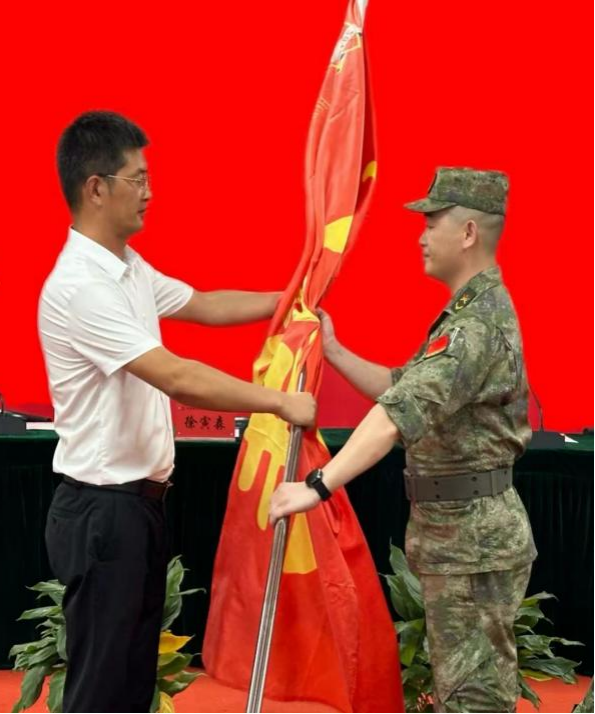 徐寅森为承训教官授旗,军训工作正式启动。