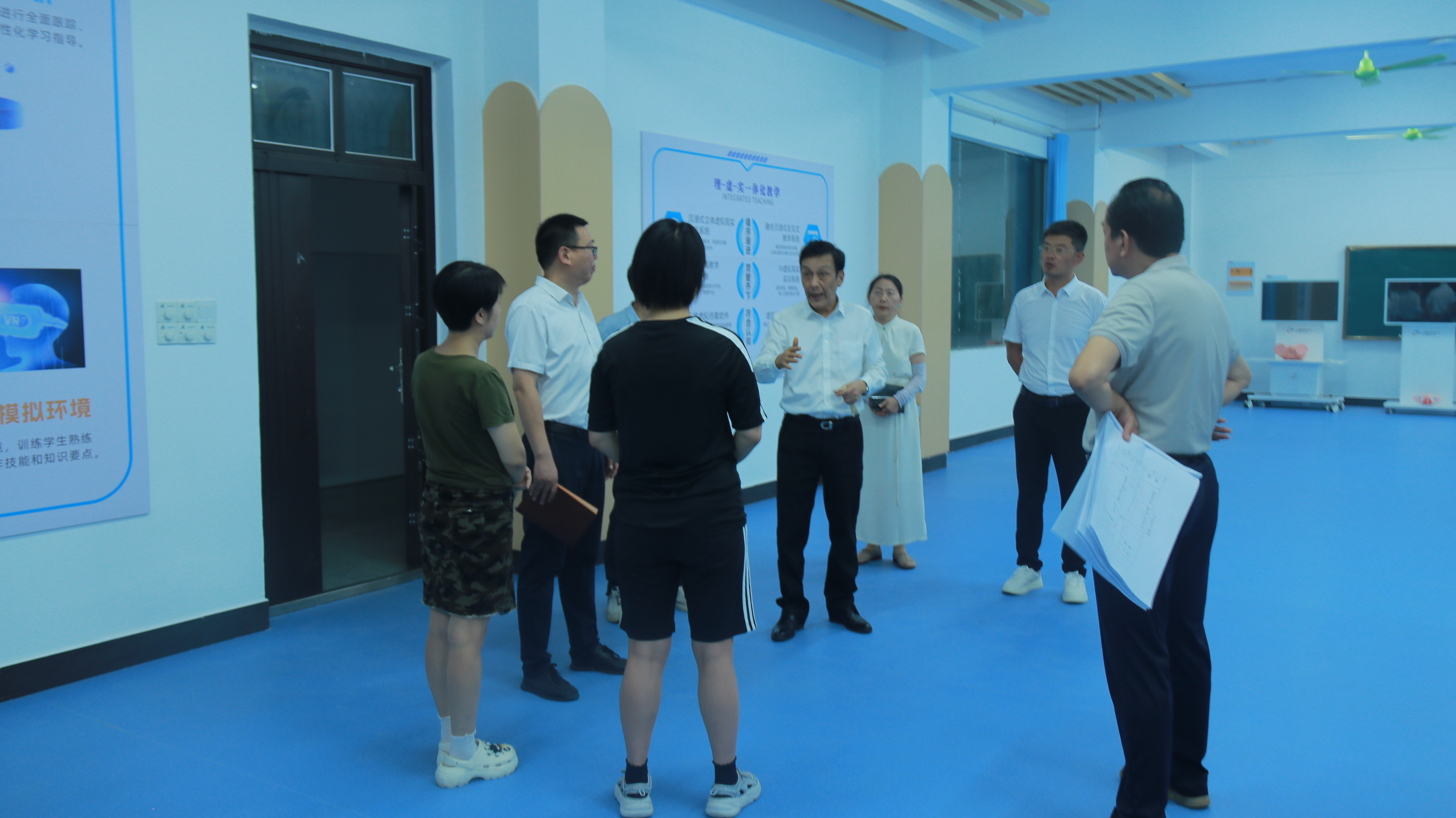在卫生健康系,王立义与新入职教师亲切交流,询问教学适应进度与职业发展需求,阮家港察看办公桌椅、多媒体设备配置;同步检查婴幼儿托育服务与管理实训室设备运行及安全制度,筑牢实训保障防线。