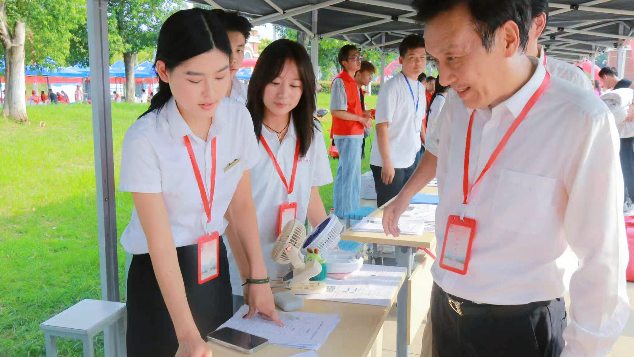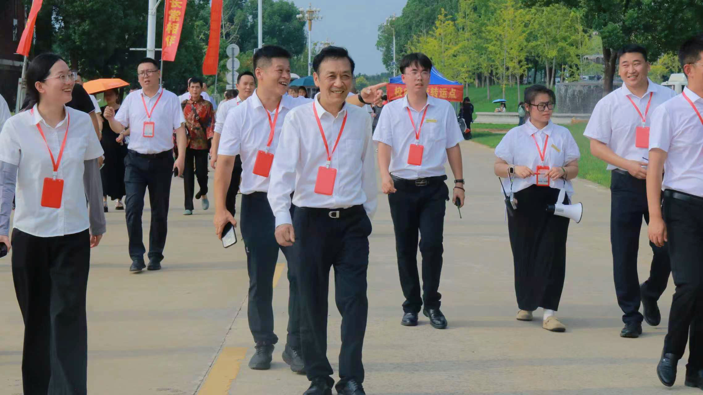在迎新现场,集团和校领导一行先后走访了新生报到处、“绿色通道”服务站、校园导览点等关键环节,与迎新工作人员及志愿者亲切交流。检查组对大家坚守岗位的奉献精神和细致周到的热情接待表示衷心感谢,叮嘱工作人员合理调配服务时段、注意防暑降温,同时对学校迎新工作的精心组织与周密部署给予高度评价,强调要以“细致入微”的服务让新生感受到家的温暖。