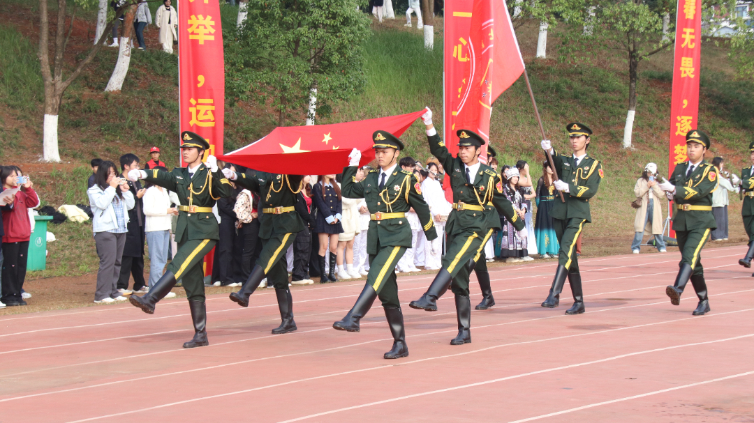 激昂的《运动员进行曲》奏响,入场仪式拉开帷幕。国旗护卫队队员身着制服,步伐铿锵,鲜红的五星红旗引领全场,踏出青春的责任与担当;校旗队紧随其后,校旗迎风招展,彰显“健康育人”的办学初心;花球队手持彩球,灵动旋转,为赛场注入蓬勃生机。