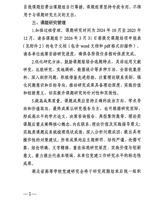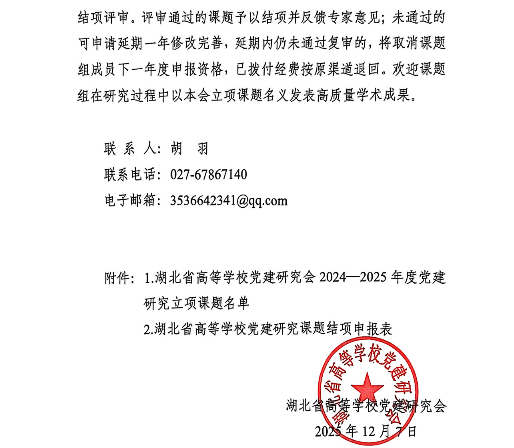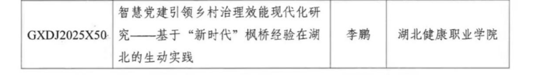 近日,湖北省高等学校党建研究会公布2024-2025年度党建研究课题立项结果,我校党务部部长李鹏主持的《智慧党建引领乡村治理效能现代化研究基于“新时代”枫桥经验在湖北的生动实践》课题获批立项。